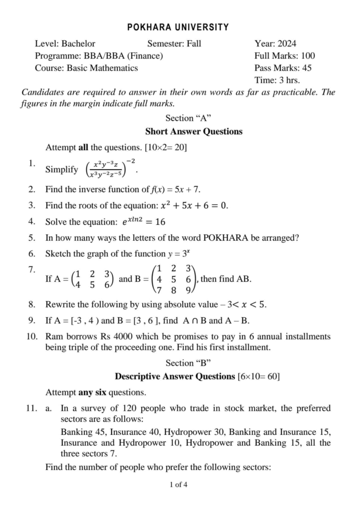 Here are the Pokhara University PU BBA BBA-BI BBA-IT Business Mathematics I Question Paper 1st Semester. This authentic resource will help you practice efficiently. Build Confidence, and Perform better in your Exam. Here is the last 5 Year Question Paper Collection. If you need a PDF of this Question paper Contact us on Social Media We will Provide you with the paper. If you have any subject Question papers share them with others through Mero Enotes.