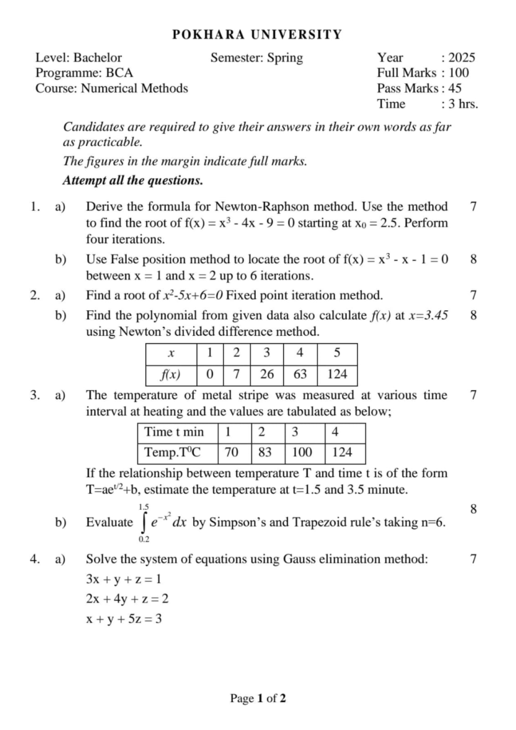 Here are the Pokhara University Pou BCA Numerical Methods Question Paper. This authentic resource will help you practice efficiently. Build Confidence, and Perform better in your Exam. Here is the last 5 Year Question Paper Collection. If you need a PDF of this Question paper Contact us on Social Media We will Provide you with the paper. If you have any subject Question papers share them with others through Mero Enotes.