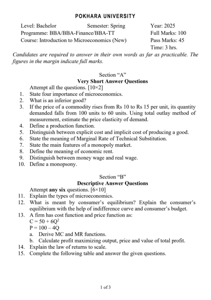 Here are the Pokhara University PU BBA Introduction to Microeconomics Question Paper. This authentic resource will help you practice efficiently. Build Confidence, and Perform better in your Exam. Here is the last 5 Year Question Paper Collection. If you need a PDF of this Question paper Contact us on Social Media We will Provide you with the paper. If you have any subject Question papers share them with others through Mero Enotes.
