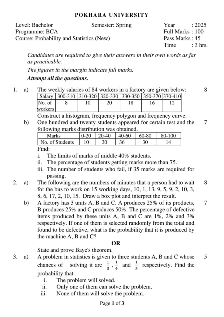 Here are the Pokhara University Pou BCA Probability & Statistics Question Paper 6th Semester. This authentic resource will help you practice efficiently. Build Confidence, and Perform better in your Exam. Here is the last 5 Year Question Paper Collection. If you need a PDF of this Question paper Contact us on Social Media We will Provide you with the paper. If you have any subject Question papers share them with others through Mero Enotes.