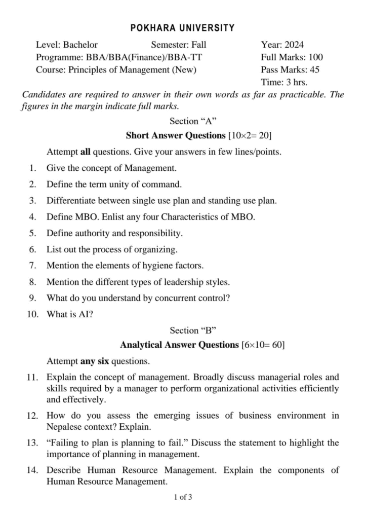 Here are the Pokhara University PU BBA, BBA-BI, BBA-IT, BCIS, BHCM, BHM Principles of Management Question Paper 1st Semester. This authentic resource will help you practice efficiently. Build Confidence, and Perform better in your Exam. Here is the last 5 Year Question Paper Collection. If you need a PDF of this Question paper Contact us on Social Media We will Provide you with the paper. If you have any subject Question papers share them with others through Mero Enotes.